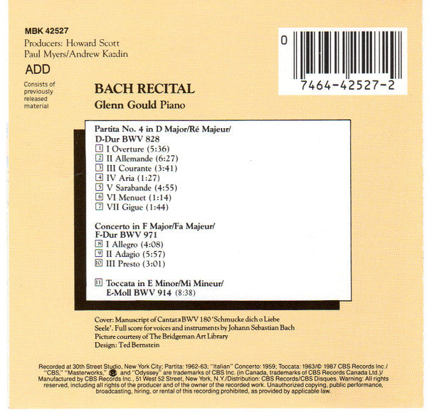 • Authenticity: CBS Masterworks, Odyssey Bach Recital - Italian Concerto - Partita, Toccata, released in 0.