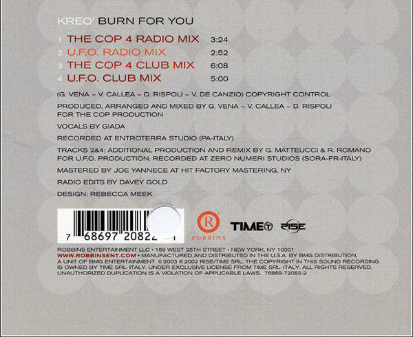 Experience the timeless voice of Kreo' in the iconic album, Burn For You. Released in 2003, this original Robbins (6) release blends Electronic music, featuring timeless performances that are a must-have for any music lover and collector.