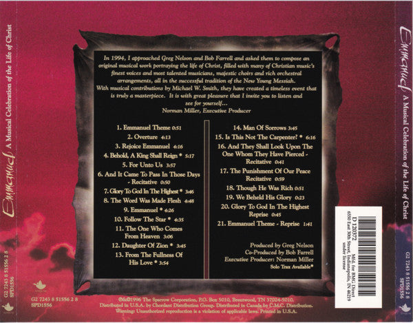 Experience the timeless voice of Various in the iconic album, Emmanuel A Musical Celebration Of The Life Of Christ. Released in 1996, this original Sparrow Records release blends Pop music, featuring timeless performances that are a must-have for any music lover and collector.