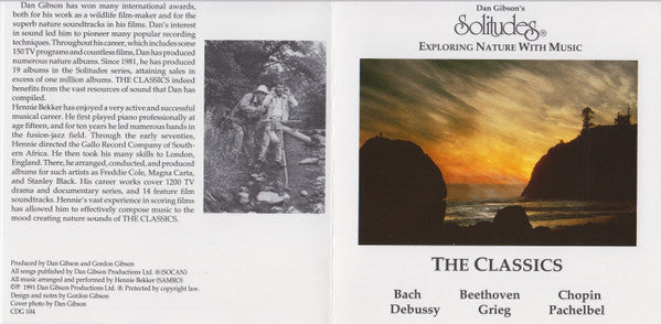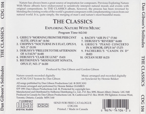 Experience the timeless voice of Dan Gibson in the iconic album, Exploring Nature With Music: The Classics. Released in 1991, this original Solitudes release blends Electronic, Classical music, featuring timeless performances that are a must-have for any music lover and collector.