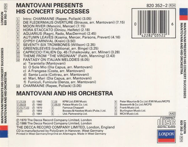 - Authenticity: London Records Mantovani Presents His Concert Successes, released in 1986.