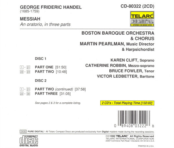 Messiah by Georg Friedrich Händel, Karen Clift, Catherine Robbin, Bruce Fowler, Victor Ledbetter, Martin Pearlman, Boston Baroque (CD)