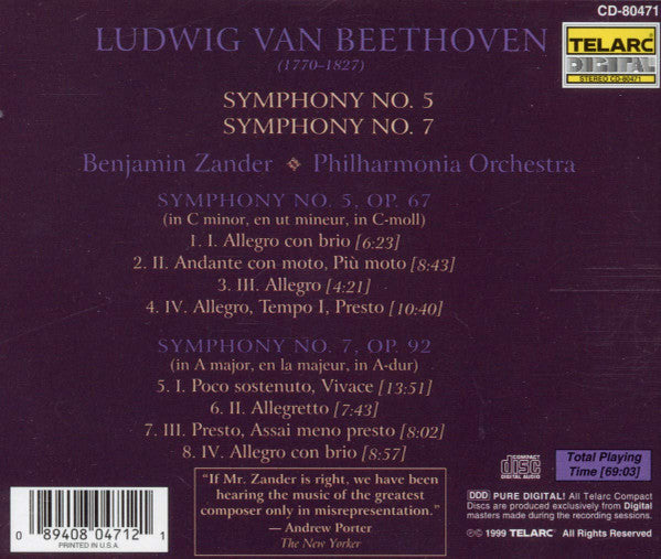 Experience the timeless voice of Ludwig van Beethoven, Benjamin Zander, Philharmonia Orchestra in the iconic album, Symphonies No. 5 & No. 7. Released in 1999, this original Telarc release blends Classical music, featuring timeless performances that are a must-have for any music lover and collector.
